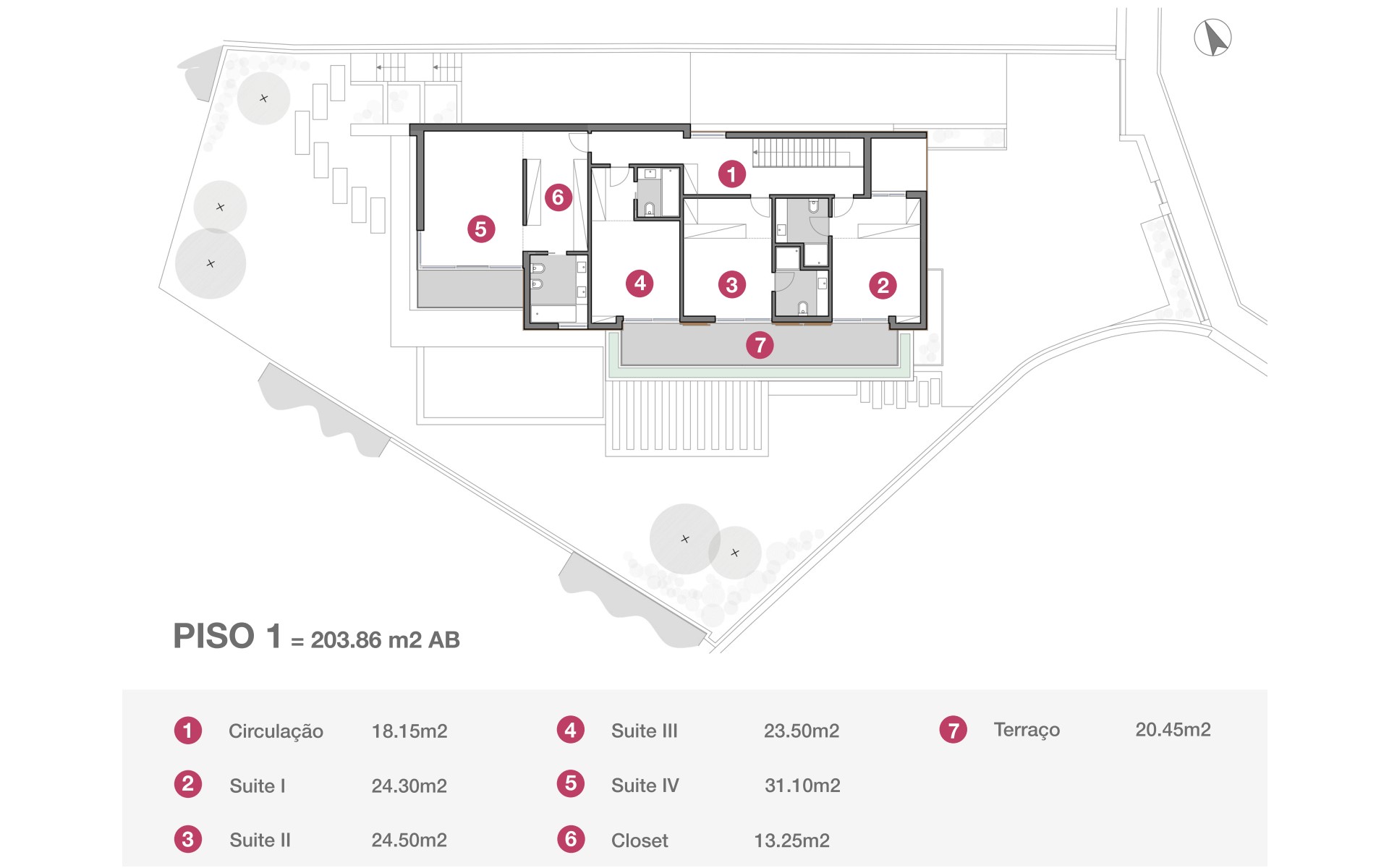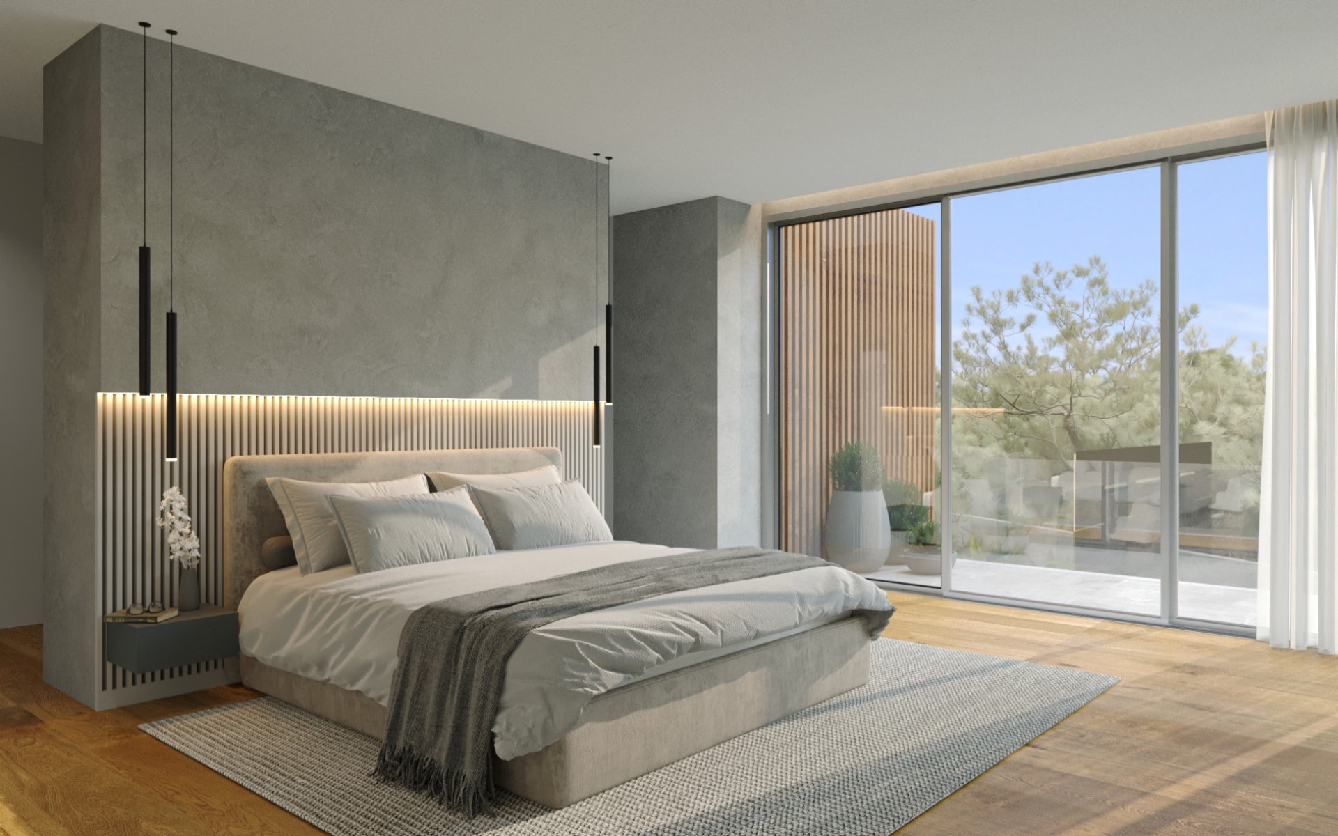 No piso 1 localizam-se os quartos, todos em suites com closet e casa de banho comum aos quartos. Três das suites terão acesso a um terraço ajardinado comum, uma delas com um rock garden privativo. No piso da cave encontra-se a lavandaria, uma casa de banho, zona de arrumos ou possível quarto, casa técnica e garagem com três lugares de estacionamento.