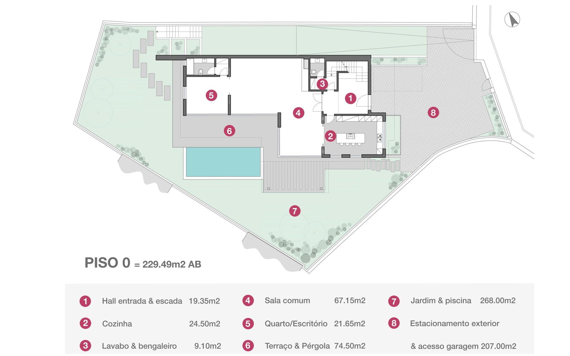 Composta por um piso térreo, que dá acesso à entrada principal, um hall onde é feita a distribuição para as diferentes zonas da casa, cozinha, sala comum, escritório com casa de banho ou suite. Através deste hall faz-se também o acesso à casa de banho social/bengaleiro, piso superior destinado à zona privativa de quartos e piso da cave. A zona social da casa é composta por dois ambientes de salas, uma zona de sala de jantar e uma zona de sala de estar.